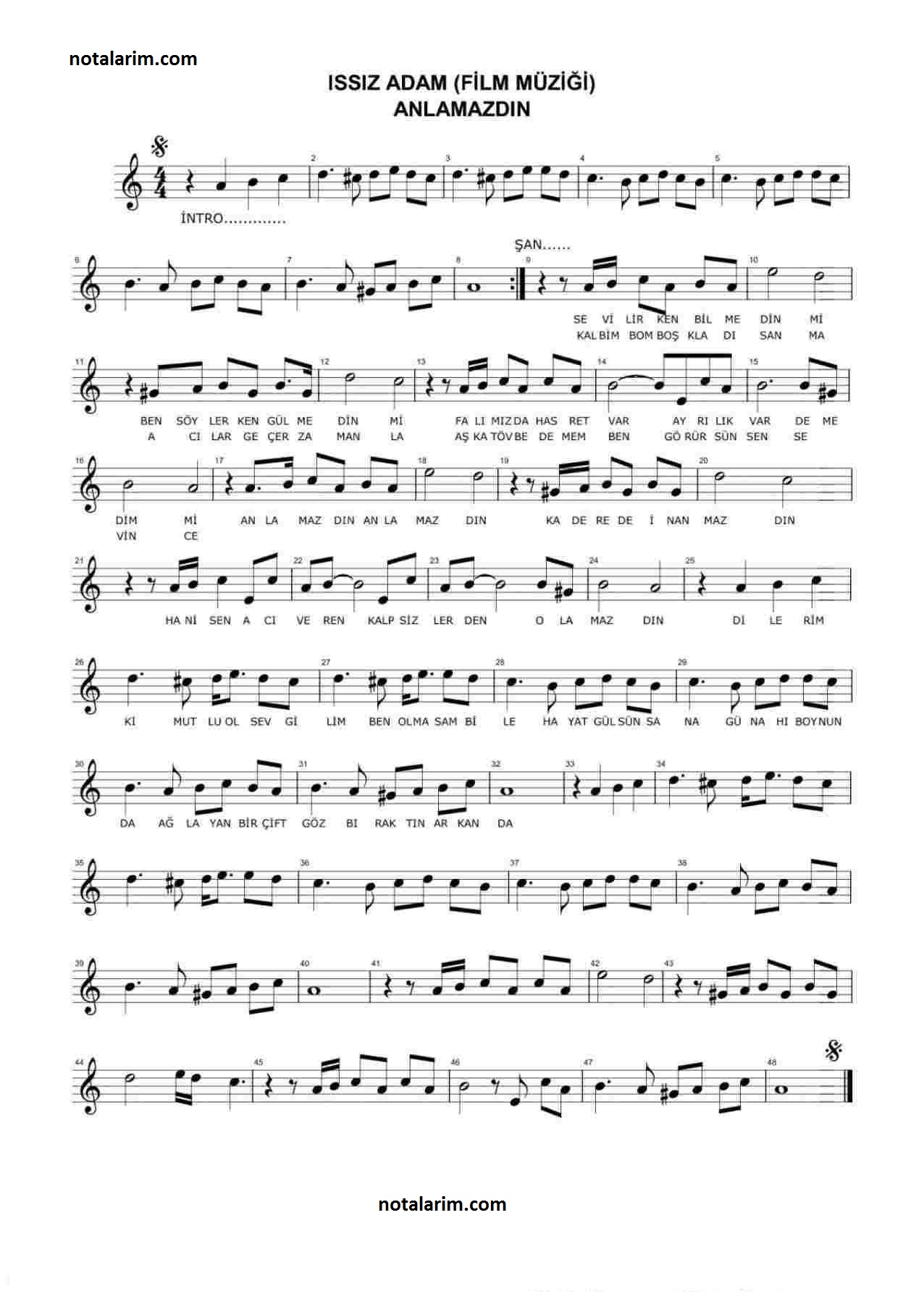 Sevilen filmlerden olan Issız Adam filminden Alamazdın şarkısını sizler için paylaşıyoruz. Şarkının Do Re Mi notaları ve Solfeji de paylaşımımız da mevcuttur. Keman Notaları için sayfamızı ziyaret edebilirsiniz.