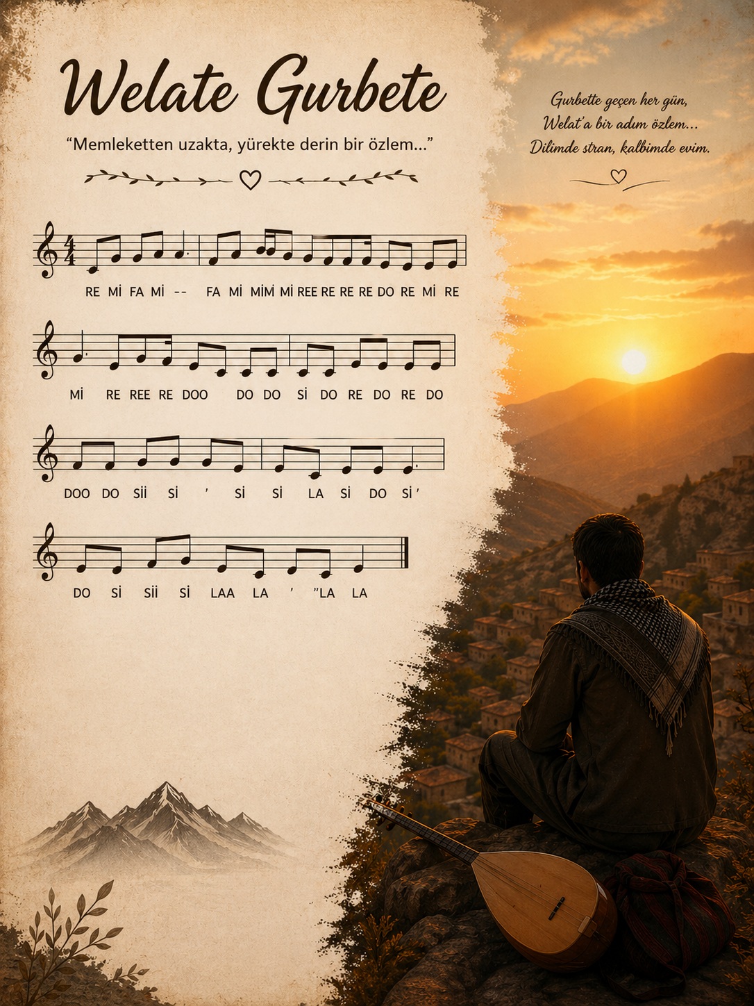 Welate Gurbete do re mi notalarını sizler için paylaştık. Welate Gurbete gibi kürtçe do re mi notalarını sayfamızda bulabilirsiniz. Notaları Keman, Bağlama, Piyano ve Melodika gibi enstrümanlar da çalabilirsiniz. Keyifli Çalışmalar Dileriz.